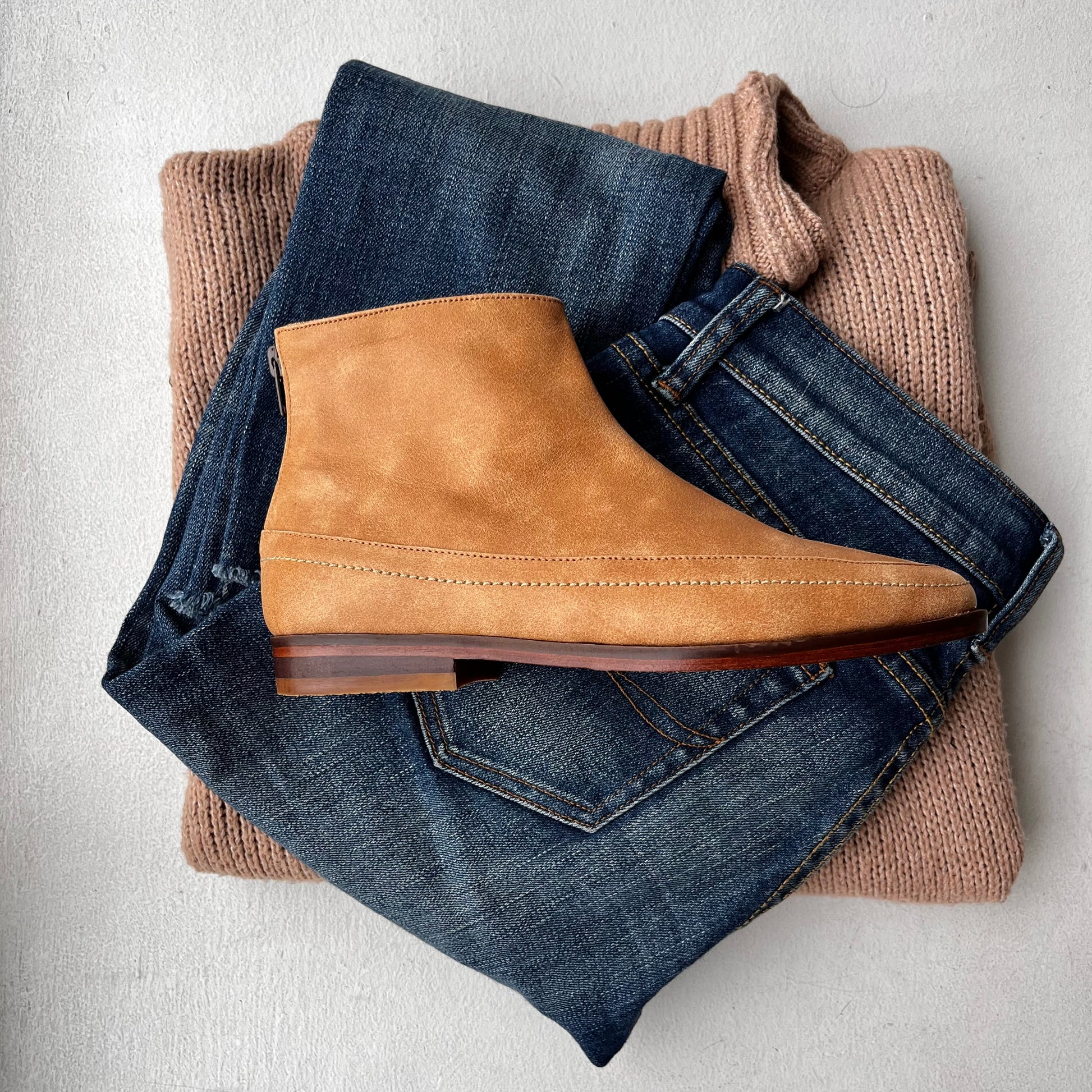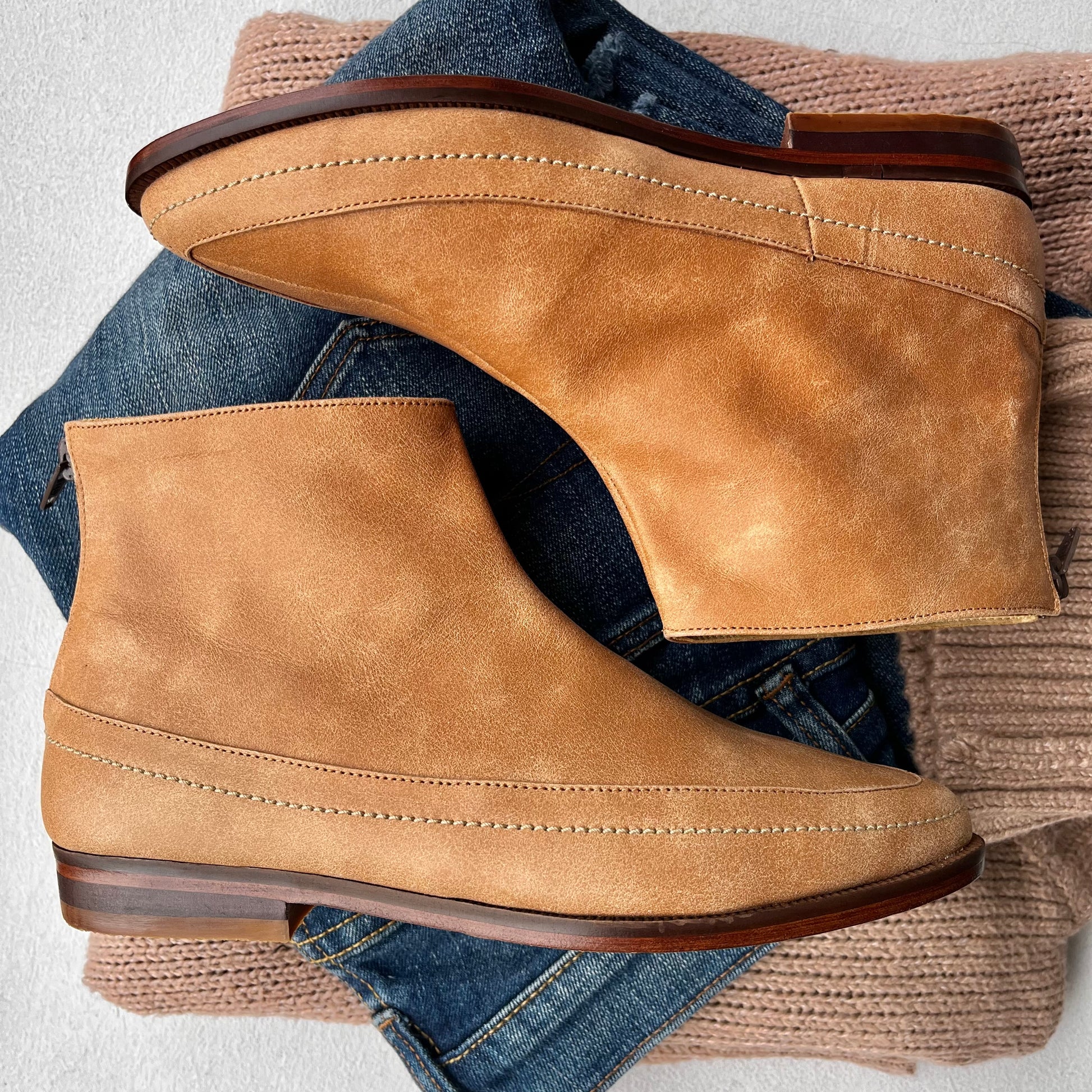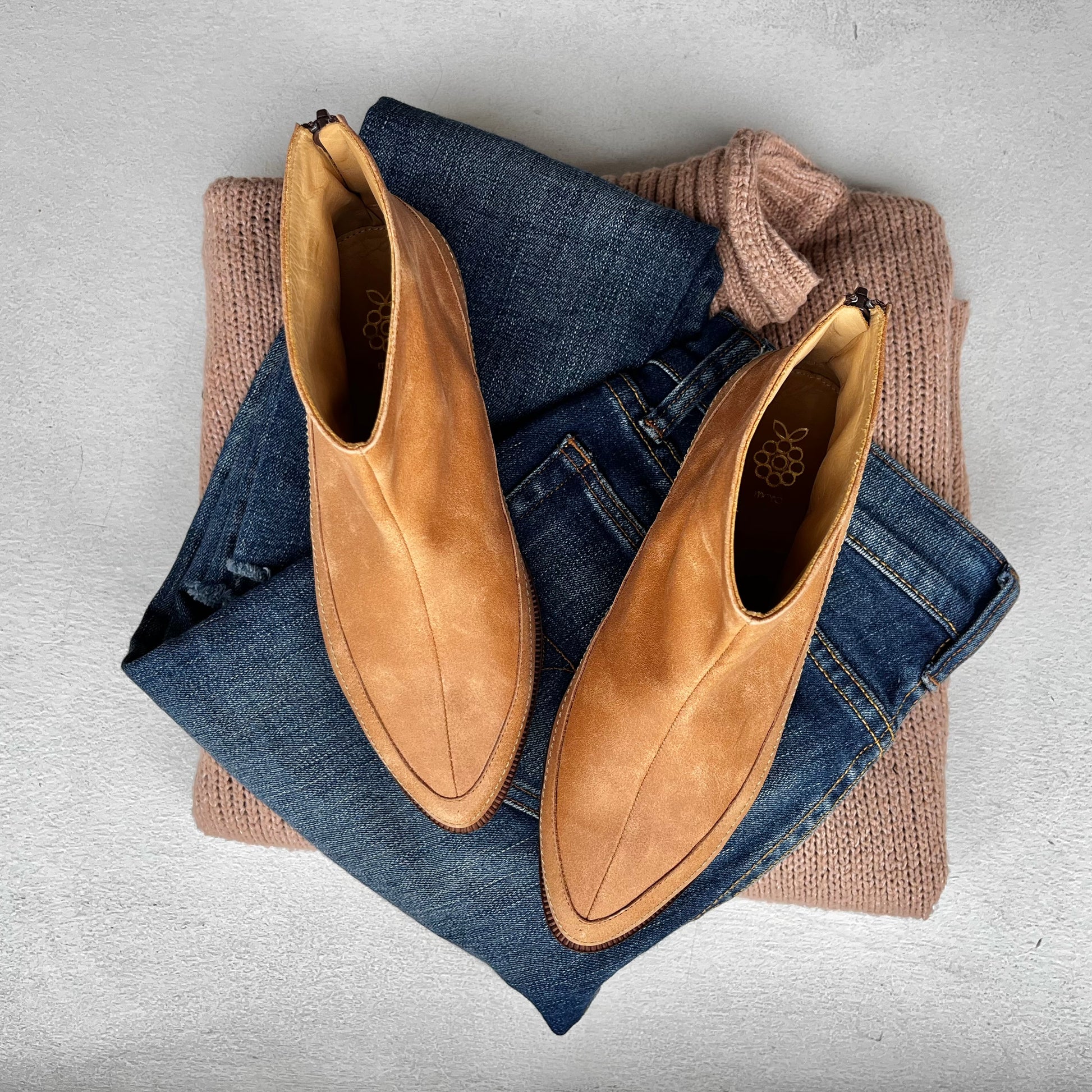 Botín 100% cuero, hecho a mano en Chile. Forro de cabritilla, planta de suela y cierre trasero. Taco cómodo de 3 cm y horma normal. Calidad y estilo en cada paso.