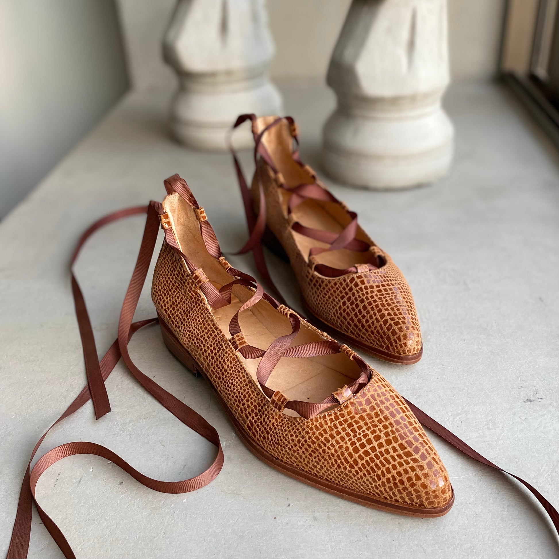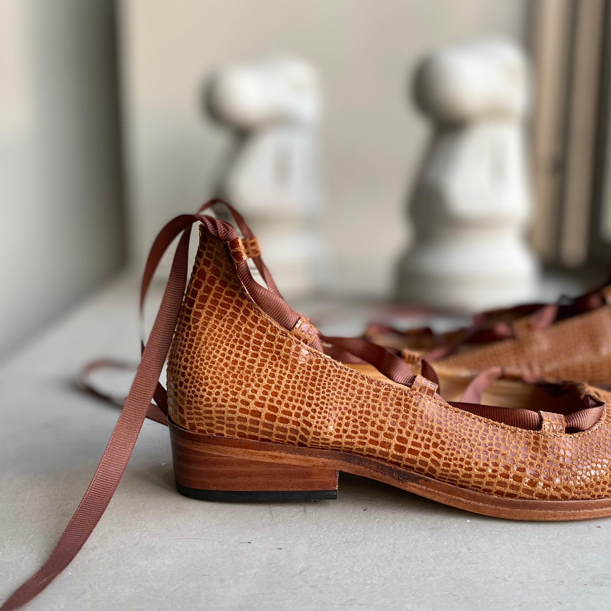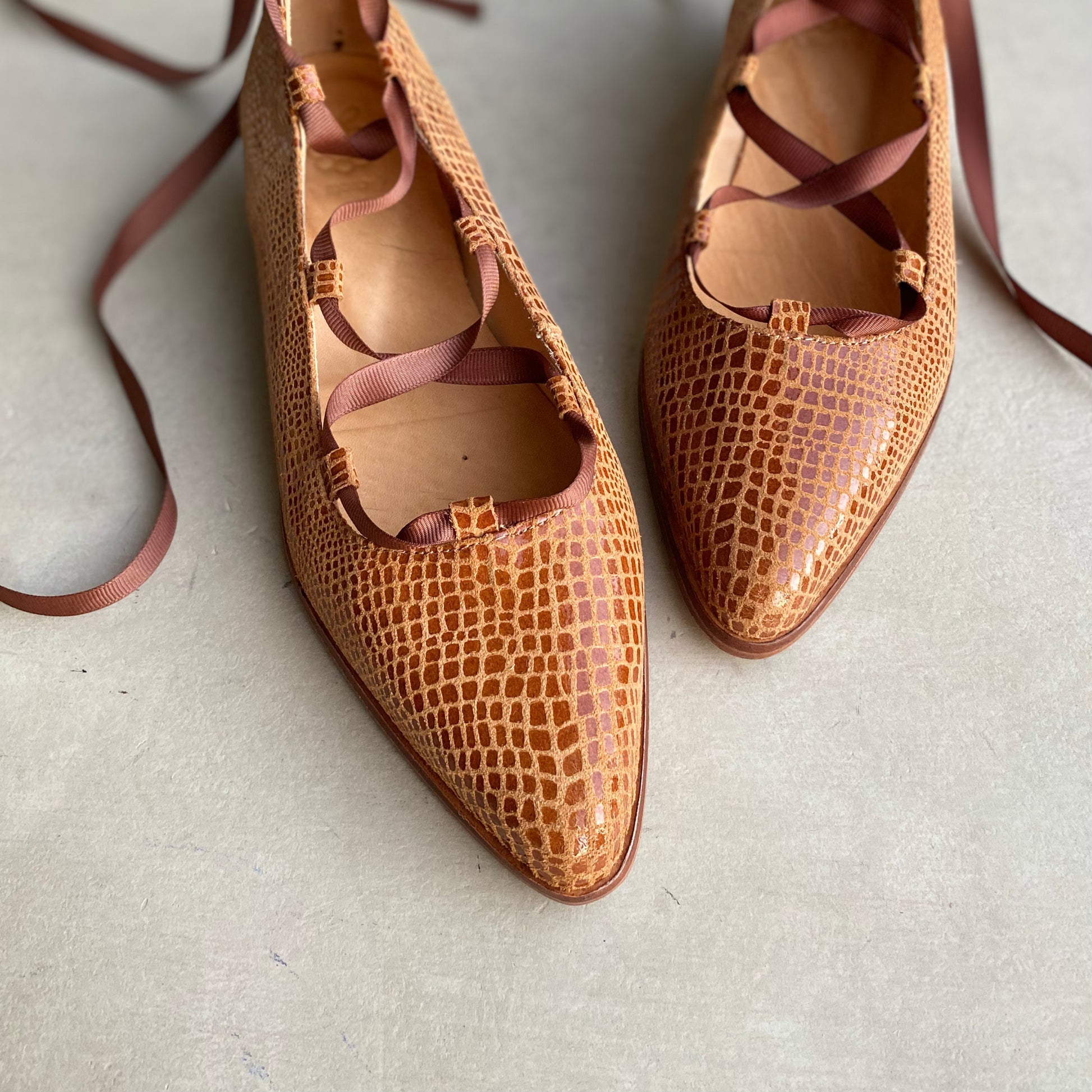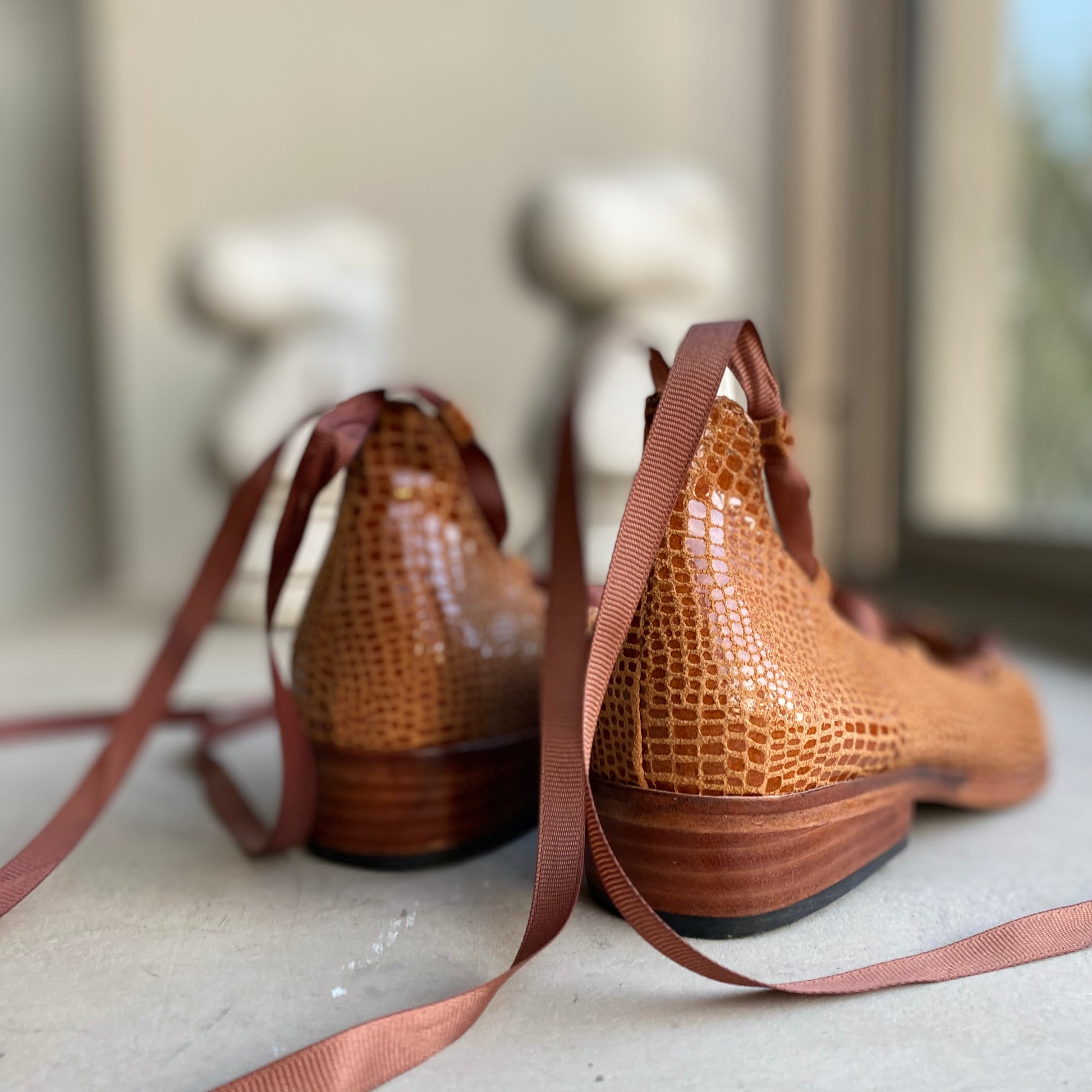 La Ballerina Juana es la combinación perfecta entre estilo femenino y carácter. Confeccionada y detallada con un elegante sistema de amarras tipo ballet, su diseño envuelve el tobillo con cintas que aportan ajuste, seguridad y un toque distintivo. La punta fina estiliza la silueta del pie, mientras que su planta baja ofrece comodidad y ligereza para el uso diario. Cada par está cuidadosamente elaborado a mano, pensado para mujeres que valoran la autenticidad en cada paso.