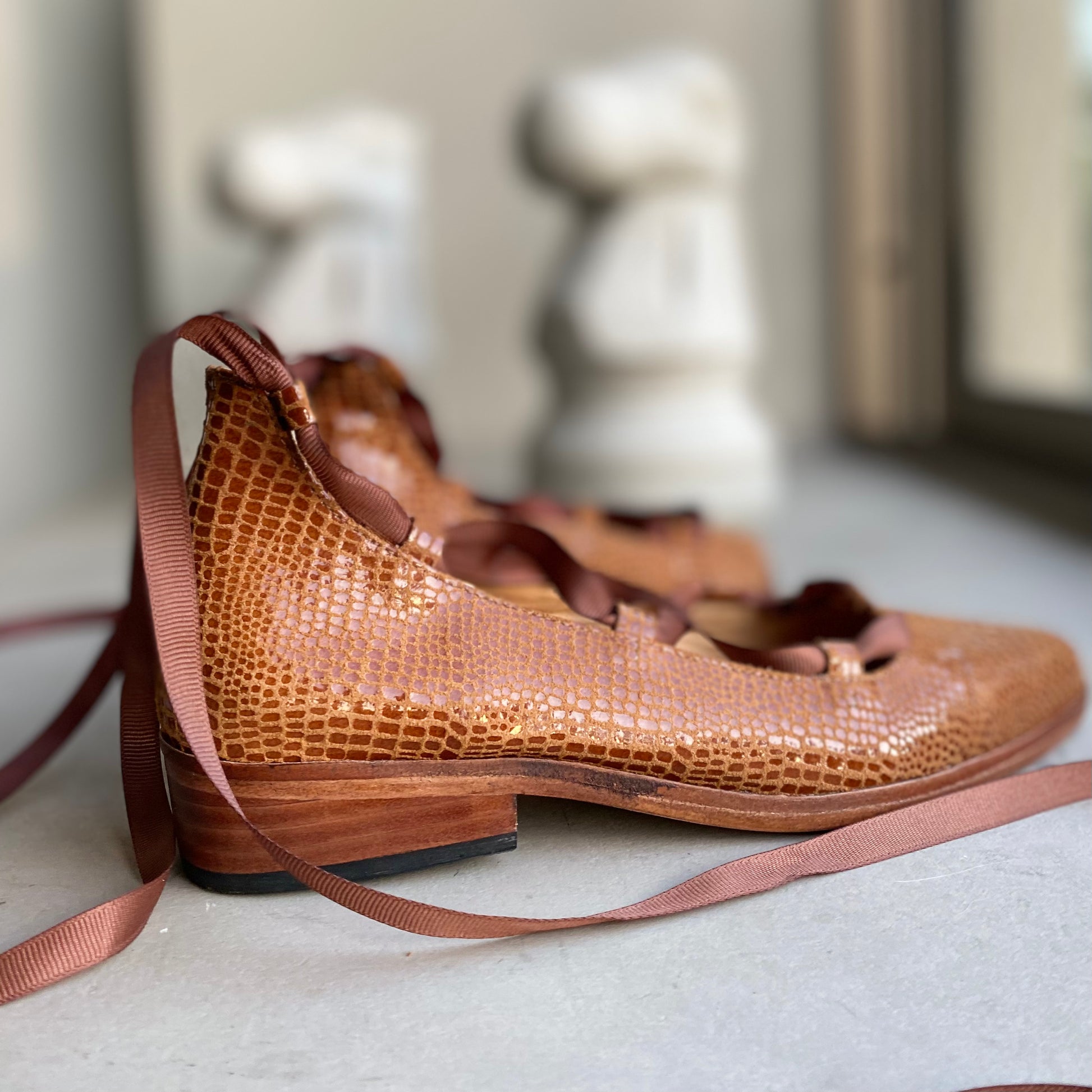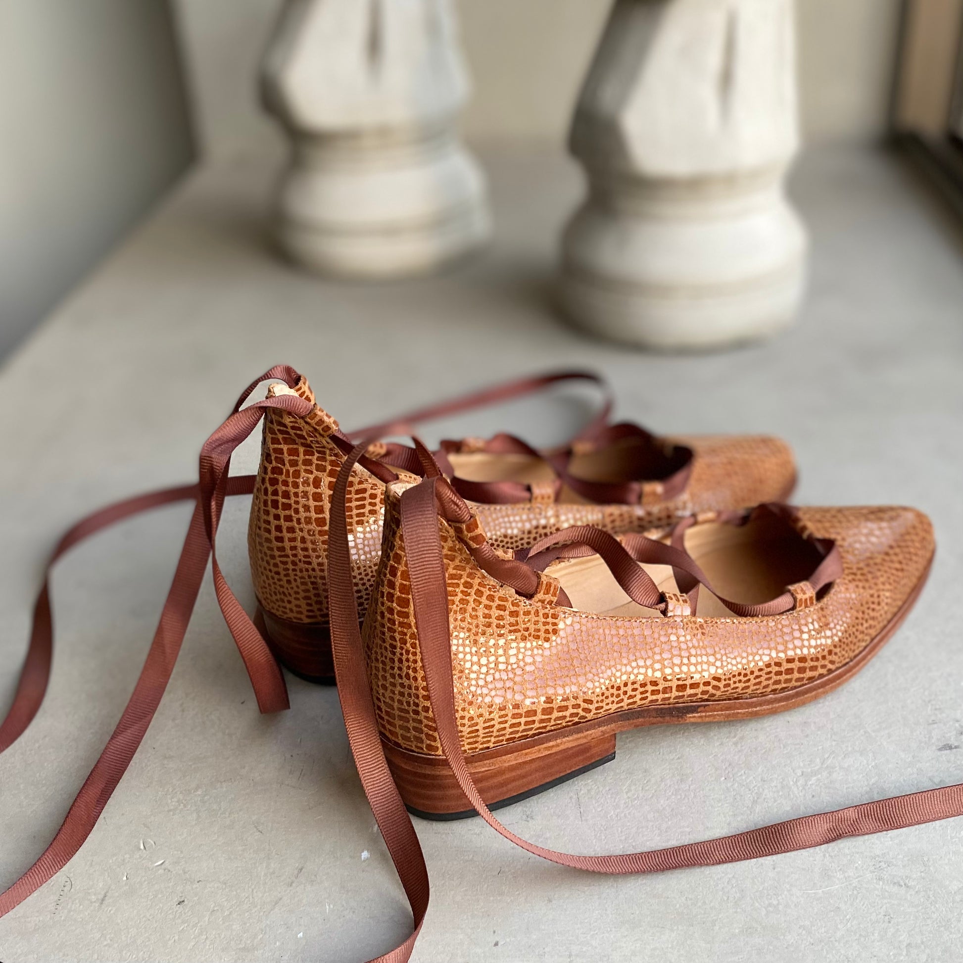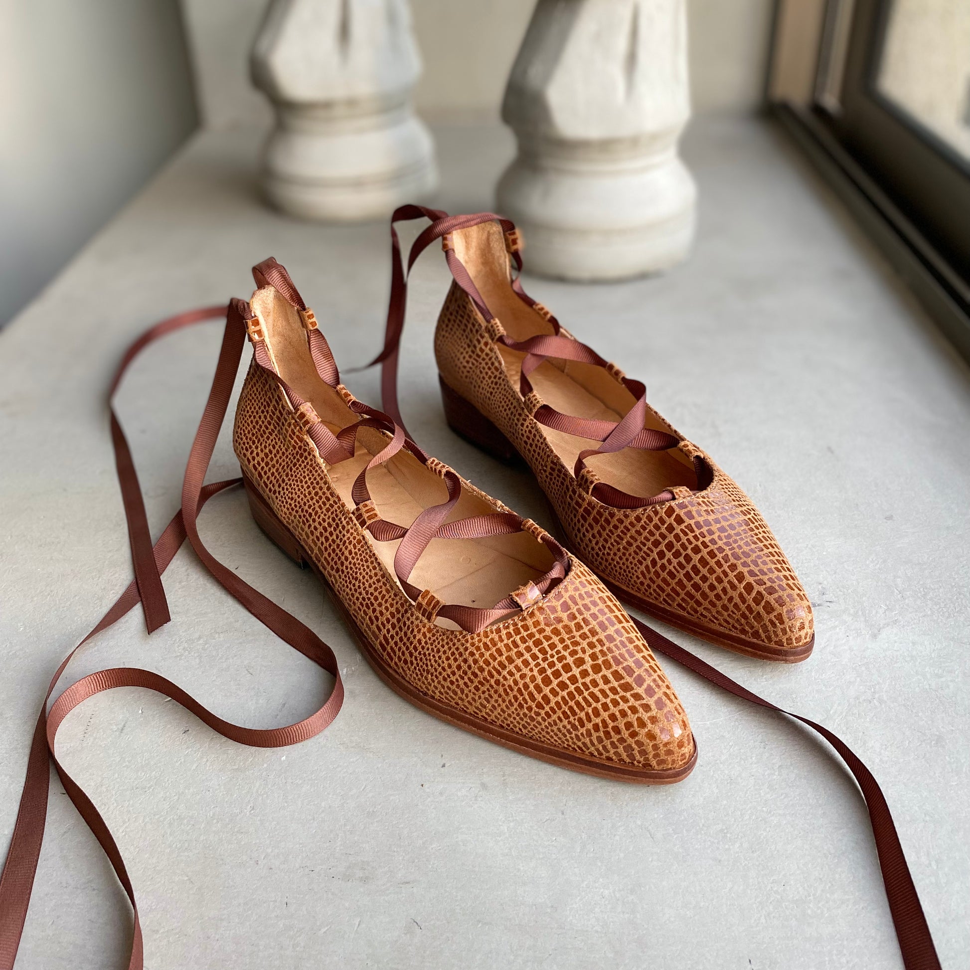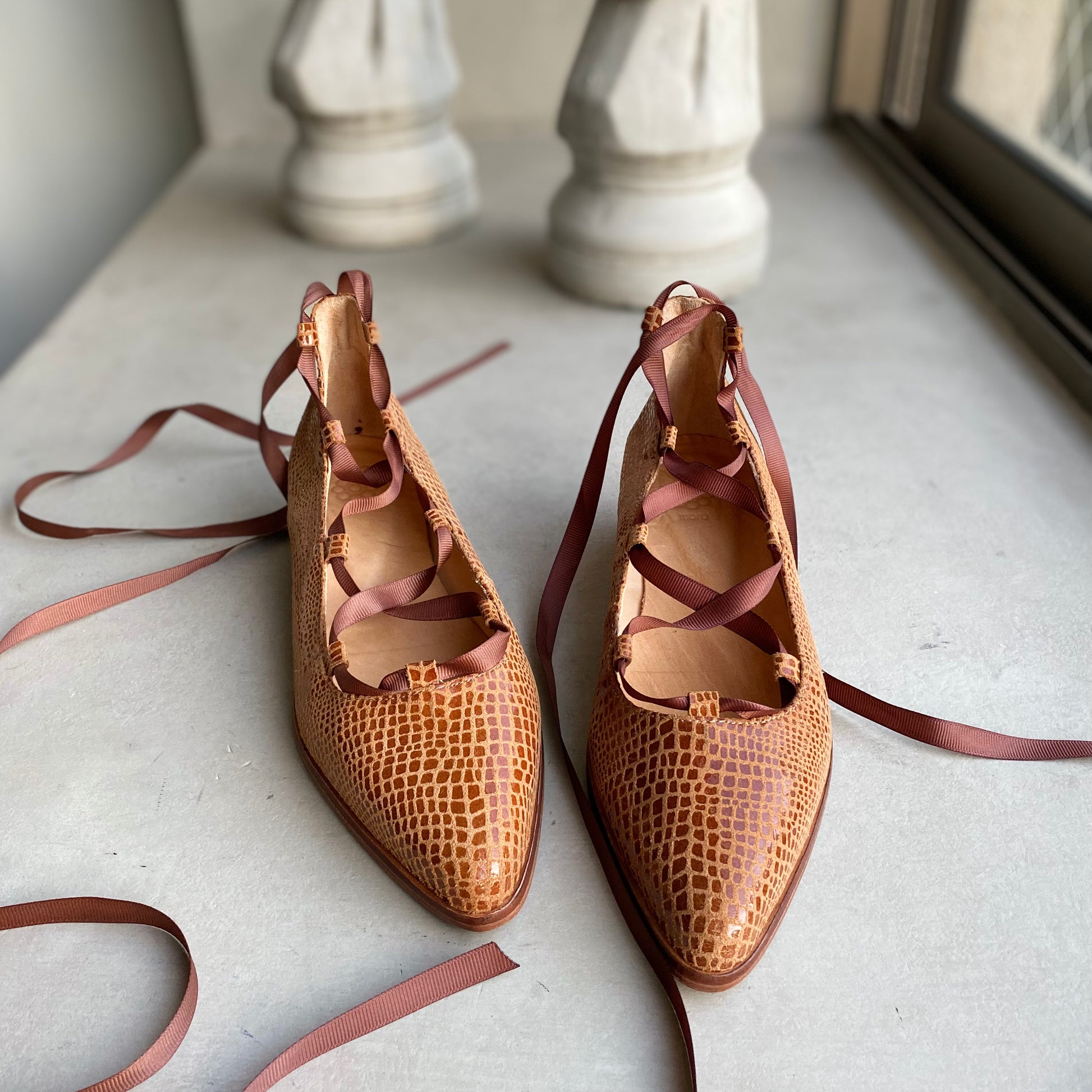 La Ballerina Juana es la combinación perfecta entre estilo femenino y carácter. Confeccionada y detallada con un elegante sistema de amarras tipo ballet, su diseño envuelve el tobillo con cintas que aportan ajuste, seguridad y un toque distintivo. La punta fina estiliza la silueta del pie, mientras que su planta baja ofrece comodidad y ligereza para el uso diario. Cada par está cuidadosamente elaborado a mano, pensado para mujeres que valoran la autenticidad en cada paso.